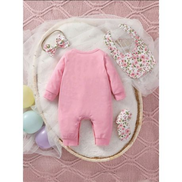 The Onesie has a matching Floral Bib, Headband and Gloves