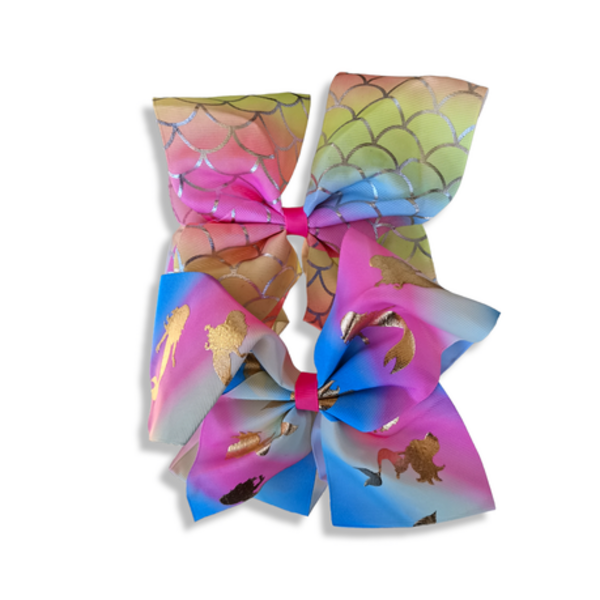 The second bow captures the essence of a mermaid’s iridescent scales, with its stunning rainbow mermaid scale pattern. It exudes a sense of ethereal beauty and uniqueness. This bow, too, comes with a convenient clip for easy attachment to various hair types and styles.